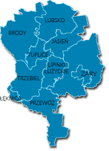 Miasta: Łęknica i ŻaryGminy: Brody, Jasień, Lipinki Łużyckie, Lubsko, Przewóz, Trzebiel, Tuplice i Żary